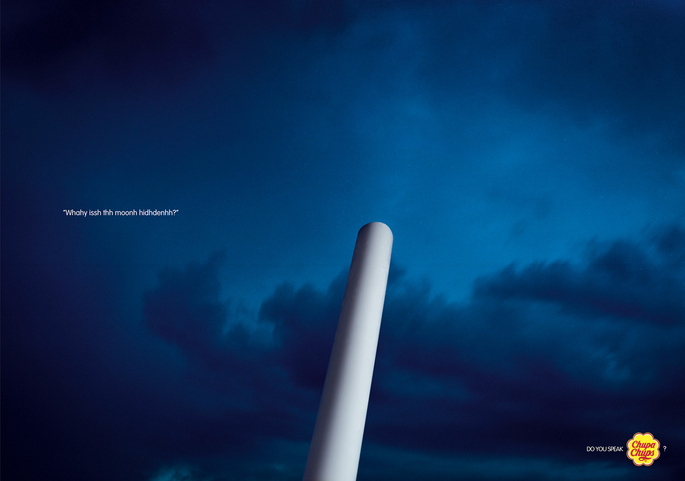 Ahora bien, la llegada a la luna no tiene porque ser un tema serio, como la tecnología del reloj Omega. La luna también ha inspirado publicidad con sentido del humor. Un Haiku japonés dice «si se aplicase un mango a la luna, !Que bonito abanico!» Quizás, inspirados por este poema, Chupa Chups pensó en el siguiente anuncio: La frase en inglés dice: «¿Por qué está escondida la luna?».