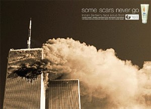 A continuación, otro anuncio más arriesgado. Su autor, Chaman Singh, fue despedido después de la polémica generada. Se trataba de una serie de imágenes para la marca de cremas para la piel VLCC bajo el slogan «Algunas cicatrices nunca se van». En principio, la idea parece buena sino fuera porque las imágenes elegidas eran escenarios de tragedias tan recientes como el colapso de las Torres Gemelas, en Nueva York. Esta campaña, sin embargo, nos proporciona una importante lección. Las marcas pueden utilizar la historia del Fin del Mundo, siempre y cuando muestren escenarios simbólicos, a modo de máscara que nunca puede ni debe convertirse en espejo. Por eso podemos disfrazarnos en Halloween: la máscara ritualiza el Terror, es decir, lo vuelve soportable. Se confirma así la intuición de Françoise Duvignaud, en su magnífico ensayo El cuerpo del Horror: «¿Y no es acaso una de las funciones de la máscara la de enviar una imagen de lo que no es, pero que podría ser, y de dejar, o mejor crear, una zona de fascinación en los límites de la razón?…