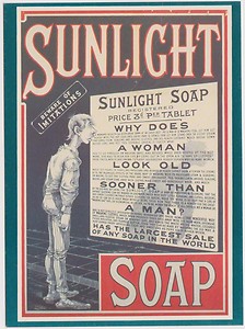 Entonces el jabón se vendía en barras de aspecto muy similar y se cortaba en piezas del tamaño deseado por el cliente. Para diferenciarse de la competencia, William Lever realizó algunos cambios en la forma de vender el jabón durante la década de 1880. En primer lugar, eligió –y patentó- un nombre breve, evocador y fácil de recordar: Sunlight. En segundo lugar, cortó el jabón en trozos regulares y, a continuación, los envolvió con un papel y una caja cada vez más atractiva. Finalmente, promocionó el producto a los cuatro vientos. Diez años después de su aparición en Inglaterra, este jabón se vendía en 134 países (para ver la publicidad en español ir a Sunlight en España). En 1886, se vendieron 3.000 toneladas. En 1910, 60.000. Le siguieron nuevos productos y, entre ellos, dos todavía en venta: el jabón Lux, y Lifebuoy. La mejor prueba del éxito conseguido por Willam fue la cantidad de imitadores que tuvo; algunos tan descarados que le pusieron a su falsificación el nombre de Zunlight. En consecuencia, en 1890, William Lever mandó diseñar uno de los primeros anuncios en defensa de la propiedad de marca, con la frase Beware of imitations (“Desconfíe de las imitaciones”).