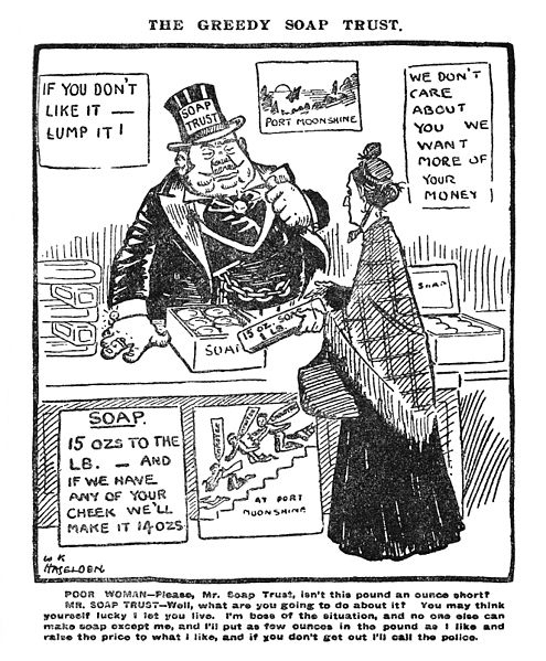 Otra mancha fue el ataque la “Soap Trust”, el primer monopolio de la industria del jabón, en 1906, y que tenía como principal representante a William Lever. El boicot fue encabezado por el Daily Mail, diario que vertió repetidos rumores contra el modelo empresarial creado por William Lever y su socio Joseph Watson (1873-1922), el otro gran fabricante de jabón de la época y, durante un tiempo, rival de William Lever. Aunque la “Soap Trust” ganó todos los pleitos legales, Watson se desengaño y cedió su parte del negocio a Lever Brothers. A continuación mostramos una viñeta humorística publicada por el Daily Mail a mediados de 1906, criticando la avaricia («greedy») de la «Soap Trust».